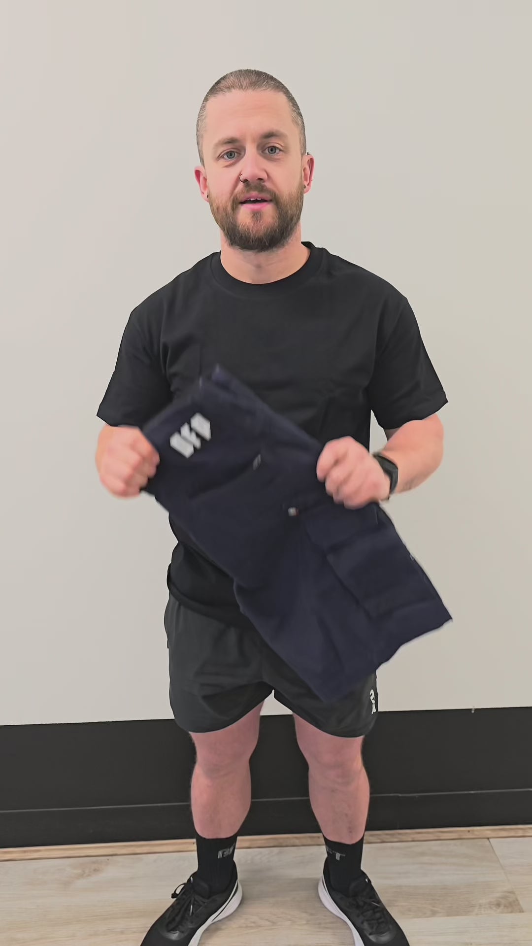 Black cargo shorts with multiple pockets on a light gray background